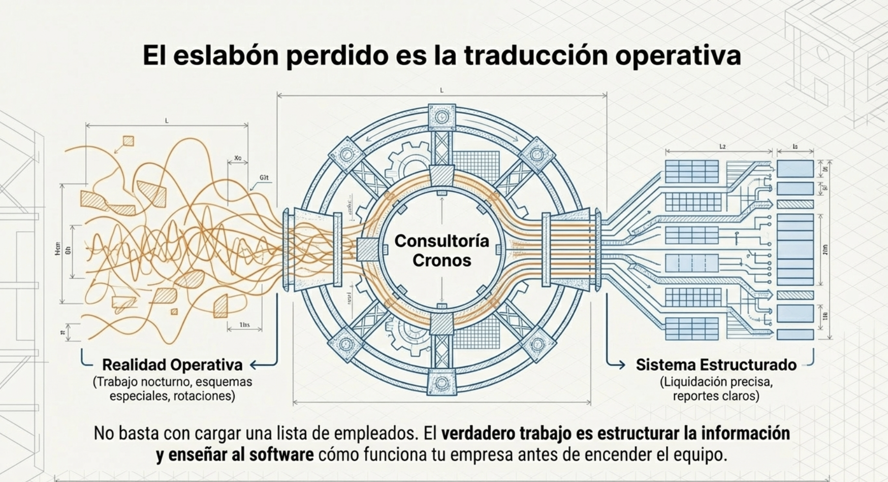 No se trata simplemente de cargar una lista de empleados en una base de datos. El verdadero trabajo consiste en estructurar correctamente la información para que el software pueda interpretar la lógica operativa de la empresa.